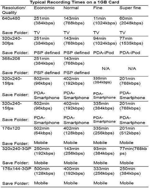 • 3GP (MPEG4+AMR) 15fps at 320x240 or 176x144 resolution