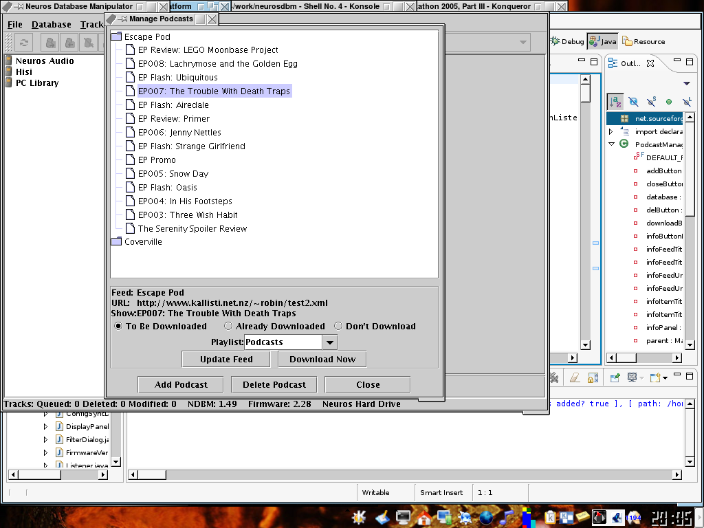 I found and fixed all the GUI bugs I know of, and so really it's just finishing off the last of the functionality (with the caveat that I haven't extensively tested it at all yet). After that I'll need to make it work from the command line (so you can download updated tracks without having the player plugged in, and when you next run NDBM and hit 'sync' they're all transferred over), but that can wait for another day (and won't be hard at all). Oh, and adding support for formats other than RSS2.0. |